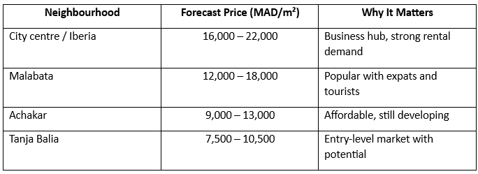If you’re considering an affordable entry point, Achakar and Tanja Balia stand out. Prices remain below the city average, yet both neighborhoods are benefiting from steady urban expansion. For those who prioritise security and long-term rental demand, the city centre, Iberia and Malabata continue to deliver.
